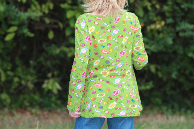 Aujourd'hui, je vous montre la tunique Peplum (modèle du magazine 1/2015) que j'ai confectionnée à la machine à coudre dans un jersey aux motifs de bonbons, pour ma gourmande de fille.